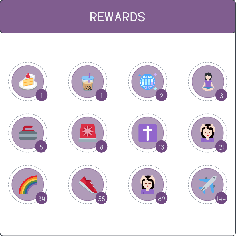 Rewards: merk elke Fibonacci dag as ‘n reward dag en beloon jouself daardie dag as jy steeds ‘n 85% dans gemiddeld handhaaf